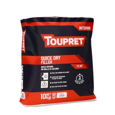 General description Toupret Quick Dry Filler is a versatile solution for interior surfaces, designed for quick repairs on walls and ceilings. This filler can be overcoated in just 3 hours with any conventional paint or wallpaper, making it ideal for both new and renovated substrates. It offers exceptional adhesion, excellent shaping qualities, and can be filled to any depth without shrinking. Technical specifications Weight: 10 kg Ready to paint time: 3 hours Working time: 30 to 40 minutes Adhesion strength (EN 16-566): > 0.5 Mpa Indoor air quality classification: Rated A+ Colour when dry: Clean white finish Recommended application temperature: +8°C to +35°C Recommended relative humidity: Below 70% Compatibility and accessories Suitable for various surfaces including gypsum plaster, plasterboard, old painted surfaces, cement, concrete, cellular concrete, breeze blocks, bricks, stone, and primed wood. Compatible with any type of filler, paint, or wall coating. Installation Easy manual