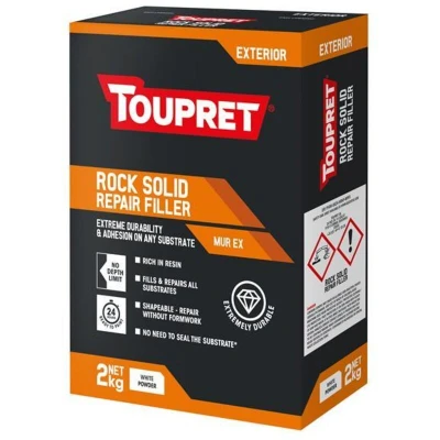 General description TOUPRET® Exterior Rock Solid Repair Filler is an extremely durable filler designed for repairs on various substrates with no depth limit. It sets to a rock-hard finish and is ready to be overcoated in just 24 hours, making it ideal for both new and renovated surfaces. Technical specifications Weight: 2 kg Type: Powder Colour when dry: White Working time: 30 minutes Ready to paint time: 24 hours Compatibility and accessories Suitable for: Gypsum plaster, old painted surfaces, cement, concrete, breeze blocks, bricks, stone, glass, and glazed tiles. Overcoat with: Any water-based masonry paint or mineral paint. If using solvent-based paints (polyurethane or epoxy), first prime with water-based exterior paint. Usage TOUPRET® Exterior Rock Solid Repair Filler is used for filling and repairing holes, gaps, and cracks on exterior surfaces. It can be shaped without the need for formwork, allowing for versatile application. Other information Product guaranteed for 6 months