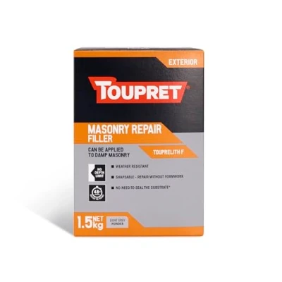 General description TOUPRET® Exterior Masonry Repair Filler is designed for filling and repairing holes, gaps, and cracks in various masonry surfaces. It can be applied to both dry and damp masonry without the need for formwork, making it versatile and easy to use. This filler is weather-resistant and can be shaped easily, ensuring a smooth finish. Technical specifications Weight: 1.5 kg Colour when dry: Light grey Adhesion filler/substrate (EN 16-566): > 0.8 Mpa Working time: 30 minutes Ready to paint time: 48 to 72 hours Recommended application temperature: 5°C to 35°C Maximum relative humidity for application: 80% Installation Apply the filler manually using a filling knife, blade, or trowel. It can be overcoated with any water-based masonry paint or mineral paint after 48-72 hours. If using polyurethane or epoxy solvent-based paints, first prime with water-based exterior paint. Usage TOUPRET® Exterior Masonry Repair Filler can be used on various rough masonry surfaces, including