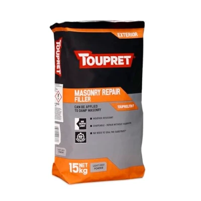 General description TOUPRET Exterior Masonry Repair Filler is designed for filling and repairing various masonry surfaces without the need for formwork. It adheres well to both dry and damp masonry, making it suitable for a range of applications. Technical specifications MPN: TOUTTTHR15 EAN: 3178310018736 Size: 15kg Type: Powder Adhesion filler/substrate (EN 16-566): > 0.8 Mpa Colour when dry: Light grey Working time: 30 min Ready to paint time: 48 to 72 hours Recommended application temperature: 5°C to 35°C Maximum relative humidity for application: 80% Installation Can be applied to all rough masonry surfaces including cement, concrete, breeze blocks, bricks, and stone. Shaping and repairing can be done without formwork. Clean tools with water after use. Usage Overcoat with any standard water-based masonry paint or mineral paint after 48-72 hours. If using polyurethane or epoxy solvent-based paints, first prime with a water-based exterior paint. Surface condition: Exterior; suitable