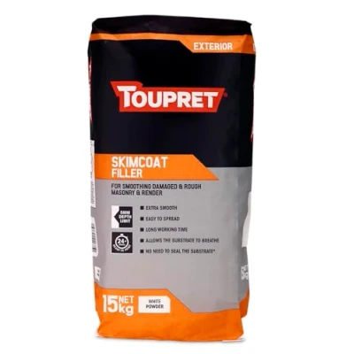 General description Toupret Exterior Skimcoat Filler is designed for smoothing damaged masonry and render surfaces, providing a smooth, ready-to-paint finish. It is ideal for large surface areas due to its easy application and excellent adhesion to various surfaces including masonry, cement, concrete, plaster, mortars, and renders. Technical specifications Weight: 15 kg Recommended Application Thickness: 1.5 mm to 5 mm Working Time: 6 Hours Ready to Paint Time: 24 to 48 Hours Colour when Dry: White Application Method: Manual or Spray Machine Usage Ideal for levelling uneven surfaces Can be overcoated with all types of water-based masonry or conventional paints For polyurethane or epoxy solvent-based paints, first prime with a water-based exterior paint Clean tools with water after use Other information Application tools: Trowel, Blade, Filling Knife Warning: Please carefully follow usage instructions and refer to the technical data sheet