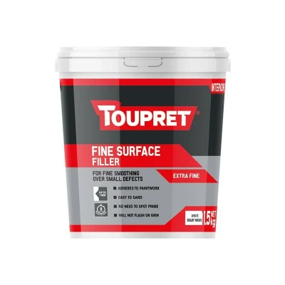General description TOUPRET® Fine Surface Filler is a ready-to-use product designed for achieving exceptionally smooth finishes on interior surfaces. It enhances the appearance of paint finishes and eliminates the need for sanding or spot priming. This filler is suitable for both new and renovated substrates, providing a flawless surface for painting or wall coatings. Technical specifications Weight: 1.5 kg Recommended application thickness: up to 1 mm Coverage: Approximately 450 g/m² at 1 mm thickness Adhesion: Strong adhesion (EN 16-566): > 0.5 Mpa Indoor Air Quality Classification: Rated A+ for excellent indoor air quality Colour When Dry: Dries to a pristine white finish Ready to Paint Time: Paint over in just 8 hours Recommended Temperature and Humidity: Apply at temperatures between +8°C and +35°C and a relative humidity below 70% Compatibility and accessories Compatible with any Toupret filler Compatible with any type of paint or wall coating Installation Easy manual