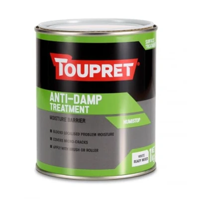 General description Toupret Anti-Damp Treatment is a water-based solution designed to block localized problem moisture on various damp substrates. It effectively covers micro cracks and dries to a flexible film, making it suitable for both interior and exterior applications. Supplied ready to use, this treatment is ideal for surfaces such as cement, bricks, stone, and old painted surfaces. Technical specifications Size: 1L Colour: White Time Between Coats: 8 Hours Ready to Paint Time: 24 Hours Coverage: Approximately 333 g/m² at 1mm thickness Recommended Application Temperature: 5°C to 35°C Relative Humidity: Below 80% Working Time: Unlimited Guarantee: 12 months from purchase Compatibility and accessories Can be overcoated with any type of paint, wallpaper, or Toupret filler Installation Apply with a brush or roller Ensure the damp substrate is clean and free from contaminants before application Apply evenly for consistent coverage Usage Ideal for surface treatment on damp surfaces