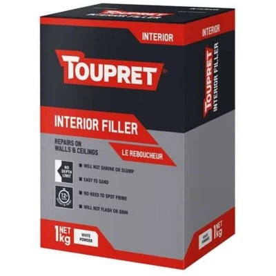 General description TOUPRET Interior Filler offers a one-coat fill that can be applied to any depth, making it ideal for filling and repairing holes, gaps, and cracks on various surfaces. It is easy to sand, does not require spot priming, and will not flash, grin, shrink, or slump. This filler is suitable for internal use and sets in 30-40 minutes, allowing for overcoating with any conventional paint or wallpaper within 12-24 hours. Technical specifications MPN: TOUTTREB701 EAN: 3178310018569 Colour: White Type: Powder Working Time: 30-40 minutes Ready to Paint Time: 12-24 hours Maximum Application Thickness: No depth limitation Adhesion: Strong adhesion (EN 16-566): > 0.5 Mpa Indoor Air Quality Classification: Rated A+ for excellent indoor air quality Colour When Dry: Dries to a clean white finish Guarantee: 12 months from the date of purchase when stored properly Compatibility and accessories Suitable for use on gypsum plaster, plasterboard, old painted surfaces, cement, concrete,