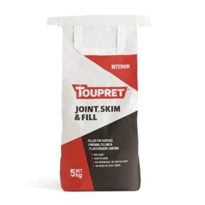 General description Toupret Joint Skim & Fill is a versatile powder product designed for surface finishing, filling, and plasterboard jointing. It is easy to sand, has no shrinkage, and allows for unlimited application depth, making it ideal for various interior projects. Technical specifications Colour: White Weight: 5kg Mixing Rate: Filling 38% water (0.38L water for 1kg powder); Adhesive/Levelling 42% water (0.42L water for 1kg powder) Application Thickness: Filling - no limit; Levelling - up to 5mm Consumption: Approximately 1.1kg/m²/mm Second Coat Time: 45 minutes Overcoating Time: 12-24 hours Working Time: 40 minutes Adhesion: Strong adhesion (EN 16-566): > 0.5 Mpa Coverage: Approximately 1100 g/m² at 1mm thickness Indoor Air Quality Classification: Rated A+ for excellent indoor air quality Compatibility and accessories Can be applied to various surfaces including gypsum plaster, plasterboard, old painted surfaces, cement, concrete, cellular concrete, breeze blocks, bricks, and
