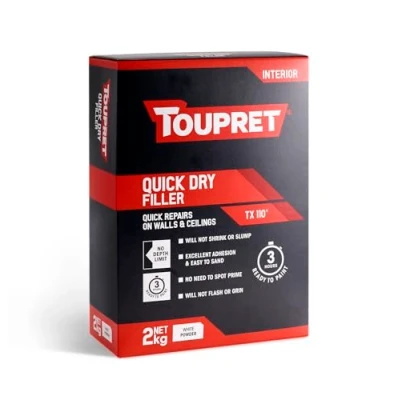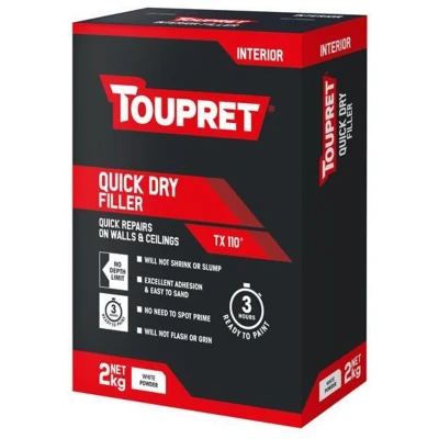 General description TOUPRET Quick Dry Filler is a versatile interior filler designed for quick repairs on walls and ceilings. It can be overcoated in just 3 hours with any conventional paint or wallpaper, making it ideal for both new and renovated surfaces. This filler can be applied to various substrates, including gypsum plaster, plasterboard, old painted surfaces, cement, concrete, breeze blocks, bricks, and stone. It offers exceptional adhesion, excellent shaping qualities, and does not shrink or slump. Technical specifications Weight: 2 kg Colour: White Type: Powder Maximum Application Thickness: No depth limitation Working Time: 30 to 40 minutes Ready to Paint Time: 3 hours Adhesion: Strong adhesion (EN 16-566): > 0.5 Mpa Indoor Air Quality Classification: Rated A+ for excellent indoor air quality Coverage: Varies based on application thickness Clean Tools With: Water Compatibility and accessories Compatible with any type of filler, paint, or wall coating Installation Easy