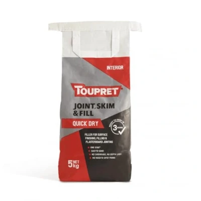 General description Toupret Quick Dry Joint Skim & Fill is an ideal solution for surface finishing, filling, and plasterboard jointing. This product is ready to overpaint in just 3 hours, easy to sand, and can be applied in one coat without shrinkage or depth limitations. It is suitable for interior use and manual applications, making it perfect for both new and renovated substrates, including unpainted or painted gypsum plaster, plasterboard, cement, concrete, breeze blocks, bricks, and stone. Technical specifications Colour: White Type: Powder Weight: 5kg Mixing Rate: Filling - 38% water (0.38L water for 1kg powder); Adhesive/Levelling - 42% water (0.42L water for 1kg powder) Application Thickness: Filling - no limit; Levelling - up to 5mm Consumption: 1.1kg/m²/mm Second Coat Time: 45 minutes Overcoating Time: 3 hours average Working Time: 40 minutes Adhesion: Strong adhesion (EN 16-566): > 0.5 Mpa Coverage: Approximately 1100 g/m² at 1mm thickness Indoor Air Quality Classification: