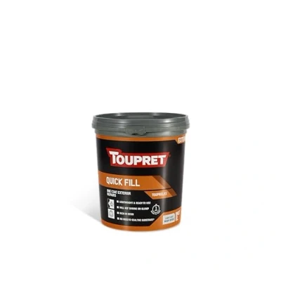 General description TOUPRET® Quick Fill is a ready-to-use, lightweight exterior filler designed for repairing holes, cracks, and gaps on various surfaces. This quick-drying filler offers a one-coat solution with no shrinkage, allowing it to be painted over in just 1 hour. Rich in resin, it provides added strength and durability, making it suitable for both painted and unpainted surfaces. Technical specifications Type: Ready-mixed exterior filler Application: One-coat repair, quick-drying Drying time before painting: 1 hour Working time: Unlimited Coverage: Varies depending on application thickness Color when dry: Light grey Adhesion strength: > 0.8 MPa (EN 16-566) Compatibility and accessories Compatible with all types of water-based masonry and conventional paints Priming required before applying solvent-based polyurethane or epoxy paints—use a water-based exterior primer first Installation Apply at temperatures between 5°C and 35°C with humidity below 80% Use a filling knife,
