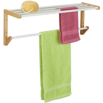 General description With the Relaxdays Towel Rail, you can keep your hand and bath towels tidy and within reach. The modern design features a stepped arrangement of four towel bars that ensures optimal air circulation for drying towels effectively. Made from robust and easy-care bamboo, the towel rail is complemented by white accents, making it an attractive addition to your bathroom. Technical specifications Overall dimensions (H x W x D): 25 x 70 x 20 cm Load capacity: max. 8 kg Weight: approx. 0.7 kg Material: Bamboo Colour: Natural, white Dimensions per towel bar (W x Ø): approx. 56.5 x 1.5 cm Distance between towel bars: approx. 4.5 cm Distance between upper and lower bar: approx. 16 cm Installation Thanks to the enclosed mounting material, the towel rail can be quickly and easily attached to the wall. Usage This towel rail is ideal for hanging hand and bath towels, with the upper towel rails also serving as a shelf for additional convenience. Other information Included in