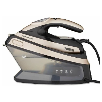 Amazon2400W POWER: With 2400W power output and fast heat up, this steam iron makes quick work of removing the creases from your clothes 4.5 BAR PRESSURE STEAM GENERATOR: Adds moisture to fabrics to make removing creases and crinkles effortless, with fast heat up in 30 seconds for quick and easy steaming DIGITAL CONTROL CENTRE: Premium LED display panel features easy to use controls to switch the iron onoff, as well as adjust the temperature and steam output settings for precision ironing CERAGLIDE CERAMIC SOLEPLATE: High-performance Ceraglide iron with a non-stick, scratch-resistant ceramic double soleplate for an effortless glide across fabrics and 30 percent faster ironing 3 YEAR GUARANTEE: Trusted Tower quality with a standard 1 year manufacturerâ€s guarantee and a 2 year extension, subject to product registration online