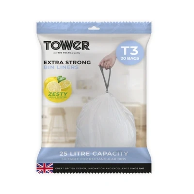 Keep your bin smelling fresh with this pack of 20 Tower lemon scented bin liners for the 25 litre Tower bins. The subtle aroma of lemon helps mask the accumulation of daily household waste, leaving your kitchen smelling that little bit fresher. Made from the strong and impact resistant high-density polyethylene (HDPE), this material gives these bin liners a higher quality and tear-resistance, so they can withstand heavier loads of household waste. Features a simple drawstring design, which provides a convenient carry handle so you can easily dispose of the bag in the outside bin without the risk of dropping it.Product SpecificationLemon scented drawstring bin linersDesigned to fit 25L Tower binsMade of HDPE materialExtra strong and tear resistantDouble-seam design with flat folded packagingSingle liner size: H60 x W70cmQty per pack: 20 linersColour: WhiteTechnical Specification:Colour: White Capacity: 25L Product Type: Bin LinersDimensions: Height: 600mm