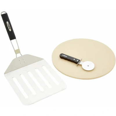 ManoManoBecome a professional pizzeria using Tower's Pizza Tool Kit. With a cutter, pizza stone and paddle included, you can seamlessly cook your favourite pizzas loaded with delicious ingredients with ease. The stainless steel body of the cutter, paddle and cordierite stone are resilient to high temperatures for continued, long-lasting use. They are also to clean; ensuring ever stage of your BBQ experience is effortless. The durable pizza stone withstands high temperatures without splitting while retaining heat easily, cooking pizzas up to 12 inches in a matter of minutes. Seamlessly slice up your pizza using the stainless steel pizza cutter but simply rolling it across for fast and simply serving. The pizza paddles ensures you can transfer the pizza from BBQ to plate safely and easily, while featuring a foldable handle for compact and convenient storage - ideal for caravans and holiday homes.
