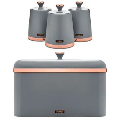 Experience the perfect blend of style and functionality with the Tower Cavaletto Grey 4 Piece Kitchen Storage Set. Boasting a chic matte finish adorned with rose gold accents, this set is not only a sight to behold but also built to withstand the rigors of daily use.Crafted with durability in mind, each piece in this set guarantees long-lasting freshness, ensuring your kitchen essentials remain in optimal condition for longer periods.Consisting of tea, coffee, and sugar storage canisters along with a matching bread bin, this set offers a comprehensive solution for organizing your pantry essentials while adding a touch of elegance to your kitchen decor.Tea, Sugar & Coffee Canisters - Dimensions: 14.8(H) x 13.5(W) x 10.5(D).Bread Bin - Dimensions: 24(H) x 35(W) x 23(D).