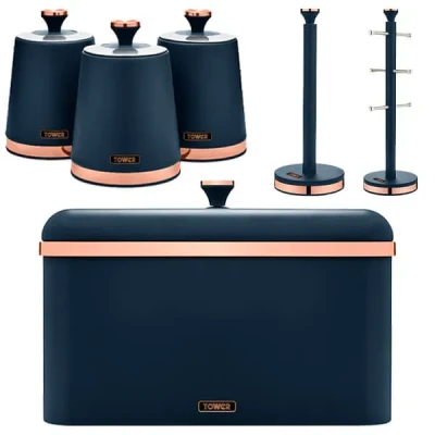 Indulge in understated luxury with the Tower Cavaletto Midnight Blue 6 Piece Kitchen Storage Set. This sleek and minimalist range is designed to elevate the aesthetic of any kitchen space, marrying contemporary design with timeless sophistication. With its matte finish and rose gold accents, each piece exudes an air of refinement, adding a touch of opulence to your countertop.Crafted with meticulous attention to detail and an eye for on-trend color combinations, these products offer the perfect balance of style and practicality.Whether you're storing tea, coffee, sugar, or kitchen towels, this set ensures your kitchen essentials are kept organized and easily accessible, all while making a statement with its luxurious design.This set consists of Tea, Coffee & Sugar storage canisters and the matching bread bin, mug tree and towel pole.Tea, Sugar & Coffee Canisters - Dimensions: 14.8(H) x 13.5(W) x 10.5(D).Bread Bin - Dimensions: 24(H) x 35(W) x 23(D).Mug Tree - Dimensions: 43.5(H) x 13.5(W) x 13.5(D).Towel Pole - Dimensions: 30.5(H) x 13.5(W) x 13.5(D).
