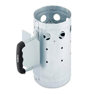 AmazonCHARCOAL STARTER PAN: Safely heats up charcoal to BBQ with, in less than 10 minutes without the need for lighter fluid - so you can start cooking deliciously smoked meats and veggies in no time BUILT FOR DURABILITY: Heavy duty galvanized iron body is resilient against rust for high quality performance, providing a safe and convenient way to start up your BBQ LARGE CYLINDER DESIGN: Measures at 28cm x 17cm to hold large amounts of charcoal needed for cooking on your BBQ, that can be easily poured from the cylinder shaped pan onto the grill STAY COOL HANDLE: The pan is complete with a stay cool plastic handle to provide added safety around high temperatures, for complete comfort and control over your charcoal 3 YEAR GUARANTEE: Trusted Tower quality with a standard 1 year guarantee and a 2 year extension, subject to product registration online