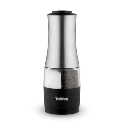DURABLE STAINLESS STEEL BODY: Crafted from durable stainless steel, this dual salt and pepper mill is the perfect accompaniment to any table setting; designed to be long-lasting and durable, the black accents offer a touch of class to your kitchen BATTERY OPERATED GRINDING: The grinder is battery operated and required 6x AAA batteries (not included) EASY PUSH BUTTONS FOR EFFORTLESS GRINDING: Effortless grinding with simple button operation; enjoy the satisfaction of seeing the operation taking place without strenuous manual handling on your part EASY TO REFILL: Easy to fill stainless steel chambers with large capacity make this elegantly designed salt and pepper mill a must-have accessory on your dining table, providing seasoning for all your favourite meals; to fill simply unscrew the mill; you can keep an eye on the level of your salt and pepper using the clear acrylic as an ideal viewing window 3 YEAR GUARANTEE: Trusted Tower quality with a standard 1 year manufacturer’s guarantee, with an optional 2 year extension, subject to product registration online