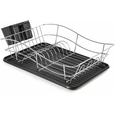 ManoManoGeneral description This rust-proof dish rack is essential for your kitchen, providing multiple storage options to efficiently dry all your dishes. Its full size can hold up to 9 dinner plates, and it includes 2 cutlery holders for storing knives, forks, and spoons. The chrome-plated stainless steel design not only allows dishes to dry properly but also protects them from unwanted chips and scratches. Additionally, it is a great space-saver that fits perfectly on most kitchen countertops, while the removable plastic draining tray ensures your worktop remains clean and tidy. Technical specifications Dimensions: 32 x 43.5 x 15 cm