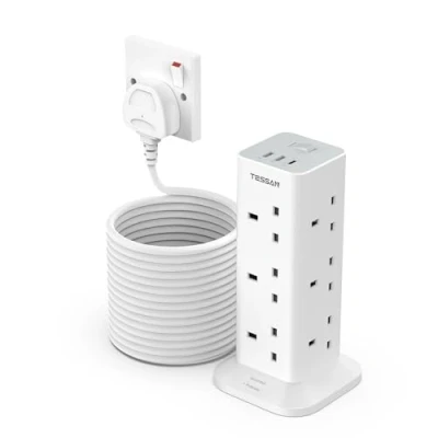 15 in 1 Plug Extension Tower: This 12 way multiple plug tower with 3 USB slots can charge up to 15 devices simultaneously without blocking each other, meet various charging needs for different devices Extension Lead 10M: TESSAN extension lead with usb slots can be more flexibile to reach distant outlets and hard-to-reach places; You can use it in any indoor place such as home, office and dorm room Plug Tower with USB C: The extension leads is equipped with USB A and USB C ports; the USB C output is 15W Max and the USB A output is 12W Max, reducing waiting time; the socket extensions is suitable for charging phones, tablets, etc Surge Protected Extension Lead: The power surge protector with 900J protects electronices from power surge attacks that might be caused by lighting or storm; A master switch controls all your electronics, which can turn off when not in use to save energy Space Saving Design: 4-side compact design tower power strip takes up little space on your desk, keeping your desk organized and tidy; 4 Non-Slip Mats at the bottom are in order to avoid slipping and sliding when using, Manufacturer: Zhuhai Tessan Power Technology Co., Ltd.