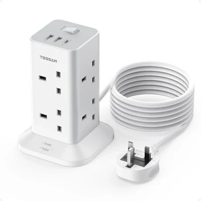 3M Extension Lead: This tower extension lead with 3M extension cord can solve the space limitation of electricity and reach many places you want. You can not only use it your kitchen, living room ,or your office but also connected your devices into outdoor place, such as your garden or yard Multiple Protection: This surge protected extension lead comes with 1700J surge protector and overload protection, which can ensure safety when you use this multi plug tower with USB ports for high rated household appliances or electric devices, etc 11 in 1 Plug Extension: The multi socket plug extension with 8 AC outlets are vertically on 4 surfaces, saving space than normal power strip. Power extension with 3 USB covers the charging needs of your home office Power Switch and Indicator Light: Switch on the top of this tower extension lead controls the whole power. You can turn off all the electronics together when not in use to save energy. 2 indicator lights, red for surge protection and green for grounded protection Stable Base with 4 Non Slip Mats: This extension plug is designed with a strong base for holding up some heavy devices. 4 non slip mats at the bottom in order to avoid sliding or falling when use, Manufacturer: Zhuhai Tessan Power Technology Co., Ltd.