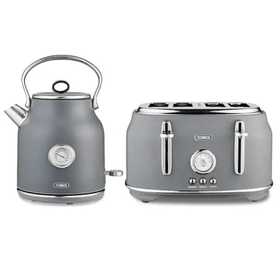 The Tower Renaissance 1.7 Litre Kettle and 4 Slice Toaster Set is finished in matt grey with luxurious chrome accents.Tower Renaissance 1.7 Litre Kettle -This 3KW kettle has rapid boil technology so that you can boil enough for a single cup in just 45 seconds. The kettle is easily accessible on the 360° base which is ideal for both left and right handed use. A handy temperature gauge shows the water temperature whilst the perfect pour and easy fill spout is designed to prevent messy spills. The spout also features a washable limescale filter.This grey kettle has a large 1.7 litre capacity and can make up to 7 cups at a time with a single fill, ideal for when you have a full house.Tower Renaissance 4 Slice Toaster -The Tower Renaissance 4 slice toaster has 7 browning levels so that you can enjoy your toast just as you like it. The toaster also has a defrost function for frozen bread and a reheat function for reheating slices already toasted.The wide slots of the toaster are ideal for bagels, crumpets and thick cut bread and features a self centering design so that everything is evenly toasted.The crumb trays are removable for allowing the toaster to be cleaned thoroughly from a build up of crumbs.Part of the Tower Renaissance Collection - a range with darker pops colour lifted by luxurious chrome accents that combines an old classic look with a unique modern twist.The Tower Renaissance 1.7 Litre Kettle & 4 Slice Toaster Set is supplied with a standard 1 year manufacturer's warranty which can be extended by an additional 2 years when you register the product online.