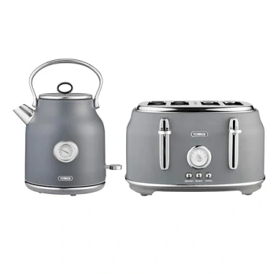 Tower Renaissance Kitchen Set, 1.7L Quiet Boil Kettle & 4 Slice Toaster, Grey, T10063GRY, T20065GRY
