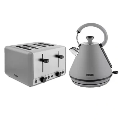 ManoManoGeneral description The Tower Sera Kettle & 4 Slice Toaster Set Grey is a stylish matching set, perfect for everyday use when serving hot drinks and toast at home. Technical specifications Kettle capacity: 1.7L Kettle power: 3KW Toaster: 4 slice capability Browning levels: 6 Usage The kettle features rapid boil for quick hot drinks. The kettle can make up to 7 cups from one fill. The toaster includes a defrost button for frozen bread, a reheat function for warming toast, and a cancel button for stopping the toasting process. Other information The kettle has boil dry protection and an automatic switch off with a blue light indicator for safety. The kettle features a detachable filter for easy cleaning and a pull-up lid for easy filling. The toaster has a removable crumb tray for easy maintenance and cord storage for a tidy worktop. The stainless steel housing with stylish black trim accents enhances any kitchen decor.