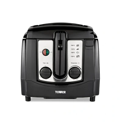 The Tower Deep Fat Fryer - Black, 3L, 2300W, Adjustable Thermostat (T17002) features a large oil capacity, rapid heating, and precise temperature control, ideal for chips and fried foods. Its removable enamel pan, odour filter, and cool touch handles provide easy cleaning and safer home frying.