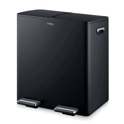 The Tower Recycling Pedal Pin with Two Compartments 40L in Black is a sleek and durable carbon steel bin featuring dual 20L compartments, hands-free pedal operation, and removable buckets for easy and hygienic waste separation, making it ideal for modern kitchens.