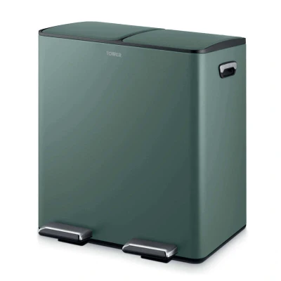 The Tower Recycling Pedal Bin with Two Compartments 40L in Forest Green features a durable carbon steel body with two separate 20L compartments for easy waste sorting, hands-free pedal operation, removable inner buckets for easy cleaning, and a stylish powder-coated finish to suit any kitchen décor.
