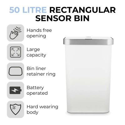 JoybuyThe Tower Rectangular ABS Sensor Bin 50L in White features a hands-free sensor lid, robust ABS plastic with stainless steel trim, and a bin liner retainer ring for easy use and maintenance—ideal for busy households needing hygienic, large-capacity waste disposal. Powered by 4x AA batteries (not included).
