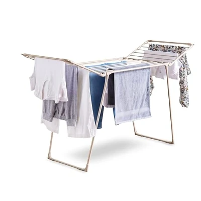 JoybuyThe Tower Winged Airer with 27 Clip Slots is a stylish, foldable powder-coated steel laundry dryer in latte, holding up to 15kg with dedicated slots for small items, hangers, and shoes; it’s lightweight, easy to store, and backed by a 1-year warranty for practical, energy-efficient drying.