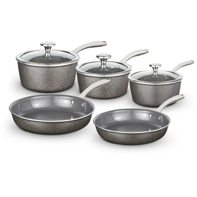 JoybuyThe Tower Cerastone Pro 5 Piece Cookware Set features ultra-tough forged aluminium pans with a superior Cerastone Pro non-stick coating, Inducto™ bonded steel bases for faster, even heating, and riveted steel handles. Suitable for all hobs including induction, dishwasher safe, and comes with up to a 25-year guarantee.