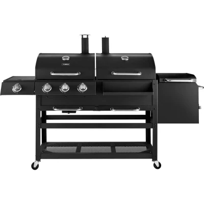 CurrysThe Tower T978507 3 Burner Grill Gas & Charcoal BBQ & Smoker is perfect for cooking for your friends and family at garden parties. It has plenty of space for your burgers, sausages vegetables and buns. The T978507 is basically two grills in one body. One side is gas powered and gives you 3 burners with dial controls. The other side runs on charcoal and has adjustable height. It can also be used as a smoker. Both sides have built-in thermometers to help you keep an eye on the food while it's cooking. Both sides also have easy to clean ash collector drawers. There is a handy shelf for your gas bottle and a sack of charcoal and the whole BBQ is on wheels, so it's easy to move in position. The durable matte black body is made of powder coated steel, so you'll be grilling and smoking for summers to come.