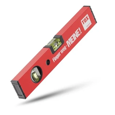 The TOX spirit level with a length of 30 cm and its fun print provides additional motivation to tackle projects - ideal as a gift, e.g. for birthdays, Christmas or Easter Levels made of transparent, robust acrylic glass with flush-mounted reading rings offer optimum visibility and accurate measurements (accuracy class 1) for horizontal and vertical inclination Easy-to-clean powder coating of the aluminum housing prevents scratches, e.g. on tiles or wood - impact-resistant rubber caps also protect against damage caused by dropping Versatile use in the home and crafts: Ideal for aligning decorations and home furnishings - the practical hanging hole makes it easy to store on a tool wall Scope of delivery: 1x TOX spirit level made of aluminum with powder coating, in red color with imprint "Finger weg - MEINE", 2 vials (horizontal/vertical) and hanging hole, 09790014, Weight: 0.4299014109 Pounds, Manufacturer: TOX