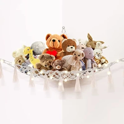 【100% Handmade】The teddy hammock is made of high quality cotton rope ,and use traditional handmade macrame rope, the toy hammock for stuffed animals will not loosen with time and change its shape, which is environmentally friendly, safe and durable.At the same time, our macrame toy hammock's meshes are smaller and denser, more beautiful and more durable 【Excellent Toy Hammock, Keep Room Tidy & Spacious】The large triangular toy hammock for stuffed animals size: 55''*42''*42'' inches, it can hangs conveniently in a corner on the wall and holds tons of kids stuffed animals toys, and will not take up extra floor space. The toy net hammock for stuffed animals is ideal for organizing your child's toys and keep room tidy and spacious. Perfect stuffed animal storage organizer for nursery,preschool, playroom bedroom, kids room 【LED Light & Tassels Plushie Hammock, Decorate Room With Boho Style】Teddy hammock toy storage net with a free LED string lights(59 inches, 3 AA batteries Not Included).10 bulbs, and 2 modes switch, it can be used as a night light. Decorated with tassels and led lights, this hanging net for stuffed animals will add bohemian style to keep your room more love. Fun way to storage and display your child's toy collection 【Safety Buckle Screw Hooks, Never Worry The Teddy Bear Storage Falling】The safety buckle hooks is made of upgrade heavy duty Carbon steel, will not deform or break. Add safety buckle design to prevent stuffed animal net or hammock from falling and ensure you kids safety. Compared with ordinary macrame teddy bear hammock hooks, our hanger hooks is much more durable and secure 【Responsible Seller, Assured Choice】 We are from the perspective of safety and comfort of mom and kids, and try our best to eliminate any question to kids and mommy. Note: Please let the teddy hammock toy storage net stay away from fire and whose maximum weight does not exceed 50 lb.If you have any questions, please contact us in time and we will provide you with the best quality service