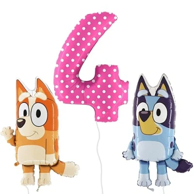 Celebrate your little ones birthday with their favourite tv characters with this amazing bluey and bingo balloon pack! You will receive 1 x 80cm (32") bluey, 1 x 80cm (32") bingo & 1 x 101cm (40") number balloon. Numbers 1-9 in a varity of colours available (please refer to picture & title). Please note that these balloons will come flat and not inflated, you must inflate these balloons yourself. Each balloon has an automatic sealing valve. They can be filled with air so they can be fixed to the wall or can be filled with helium so that they float., Manufacturer: Toyland®