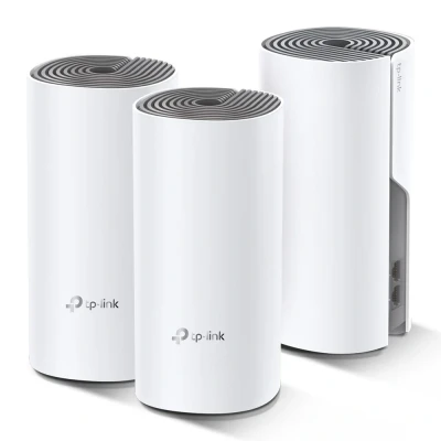 AC1200, 2.4+5 Ghz, 300+867 Mbps, 2× 10/100 Mbps, 90.7x90.7x190 mm, 3-Pack TP-Link AC1200 Whole Home Mesh Wi-Fi System, 3-Pack. Product colour: White, Grey, Antenna type: Internal, Product type: Mesh system. Wi-Fi band: Dual-band (2.4 GHz / 5 GHz), Top Wi-Fi standard: Wi-Fi 5 (802.11ac), WLAN data transfer rate (max): 1167 Mbit/s. Firewall security: SPI Firewall. AC input voltage: 100 - 240 V, AC adapter input current: 0.3 A, AC input frequency: 50 - 60 Hz. Compliance certificates: RoHS, CE, Certification: FCC, IC, NCC, BSMI, IDA,RCM, JPA, JRF, VCCI, KC Fast. Stable. Everywhere. Wi-Fi Dead-Zone Killer Deco E4 is the simplest way to guarantee a strong Wi-Fi signal in every corner of your home up to 4000 Square feet(3-pack).Wireless connections and optional Ethernet backhaul work together to link Deco units, providing even faster network speeds and truly seamless coverage.Want more coverage? Simply add another Deco. Seamless Roaming with One Wi-Fi Name TP-Link Mesh means Deco units work together to form one unified network. Your phone or tablet automatically connects to the fastest Deco as you move through your home, creating a truly seamless Wi-Fi experience. No More Buffering Network speeds three times faster than previous generation routers, thanks to 802.11ac wireless technology, make Deco capable of providing a lag-free connection to up to 100 devices. 2-in-1 Router and Access Point Modes Flexible and multifunctional, the Deco E4 includes a variety of features allowing it to serve as a router or access point. Just choose the mode for your actual network demands and experience the maximum wireless flexibility. Robust Parental Controls Simple, intuitive parental controls make it easy to keep your children safe while they’re online. All Decos Can Work Together Deco E4 is compatible with every other Deco model to form a Mesh network. Expand Mesh Wi-Fi coverage anytime by simply adding more Decos. Wi-Fi Made Easy App-Based Setup Installing Deco E4 is fast and easy. Just unpack the system, download the Deco app and follow its onscreen directions. Easy Management Manage your Wi-Fi at home or away in the Deco app, including seeing the connected devices, prioritizing your devices, setting up a guest network and more. Voice Control Pair with Alexa to control Deco E4 with simple voice commands. Enjoy the convenient life. 3 year Design Certification FCC, IC, NCC, BSMI, IDA,RCM, JPA, JRF, VCCI, KC Storage relative humidity (H-H) 5 - 90% Operating relative humidity (H-H) 10 - 90% Storage temperature (T-T) -40 - 70 °C Operating temperature (T-T) 0 - 40 °C Reset button Yes Antennas quantity 2 Antenna type Internal LED indicators LAN, WLAN Product type Mesh system Product colour White, Grey Wireless LAN features Guest access Yes Dynamic DNS (DDNS) Yes Dynamic IP Yes Static IP Yes Security algorithms WPA-PSK, WPA2-PSK Networking standards IEEE 802.11a, IEEE 802.11ac, IEEE 802.11b, IEEE 802.11g, IEEE 802.11n WLAN data transfer rate (second band) 867 Mbit/s WLAN data transfer rate (first band) 300 Mbit/s WLAN data transfer rate (max) 1167 Mbit/s Wi-Fi standards 802.11a, 802.11b, 802.11g, Wi-Fi 4 (802.11n), Wi-Fi 5 (802.11ac) Top Wi-Fi standard Wi-Fi 5 (802.11ac) Wi-Fi band Dual-band (2.4 GHz / 5 GHz) Features Parental control Yes Number of guest networks (2.4 GHz) 1 Number of guest networks (5 GHz) 1 BeamForming Yes Firewall security SPI Firewall Port forwarding Yes Quality of Service (QoS) support Yes Protocols DHCP server Yes DHCP client Yes Ports & interfaces DC-in jack Yes Ethernet LAN (RJ-45) ports 2 Power AC adapter output current 0.85 A AC adapter output voltage 9 V AC input frequency 50 - 60 Hz AC adapter input current 0.3 A AC input voltage 100 - 240 V Technical details Harmonized System (HS) code 85171800 Compliance certificates RoHS, CE Sustainability compliance Yes Weight & dimensions Package weight 1.74 kg Package height 160 mm Package depth 235 mm Package width 353 mm Height 190 mm Depth 90.7 mm Width 90.7 mm Packaging content Ethernet cable Yes Number of units included 3 pc(s) AC adapter included Yes Number of products included 3 pc(s)