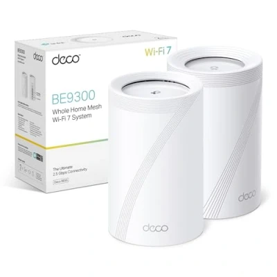 TP Link Deco BE65(2 pack) BE9300 Mesh WiFi 7, Tri Band Seamless AI Roaming, System with MLO,2,5 Gbps Ports, 4K QAM, VPN Encryption,APP Control, Google Home, Alexa, HomeShield