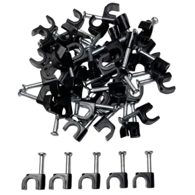 High-Quality Material: Our cable clips are made with sturdy polyethene and come equipped with strong steel nails, ensuring durability and longevity. The black colour seamlessly blends with most backgrounds for a neat appearance. Protects Cables: The round design of these cable clips delicately holds cables without pinching or damaging them, maintaining the integrity of the wiring and preventing any loss in signal or electrical capacity. Easy Installation: The integrated nails make installation quick and hassle-free. Just position the clip around the cable against the desired surface, and hammer the nail in. Great for DIY projects and professional installations alike. Versatile Use: Perfect for securing various types of cables, including ethernet, coaxial, electrical, and audio wires. Ideal for use in homes, offices, workshops, or any area requiring cable organisation and management. Indoor & Outdoor Application: These cable clips are designed for indoor and outdoor use. The corrosion-resistant nails make them suitable for installing cables outside, even in damp or humid conditions, without worrying about rust or degradation.