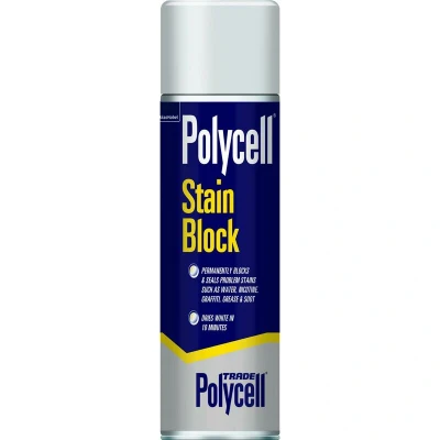 General description Polycell Stain Block is an effective aerosol paint designed to permanently cover a wide range of stains, including nicotine, soot, rust, grease, ballpoint pen ink, and lipstick. It is particularly suitable for large problem areas. Technical specifications Coverage: 7.9 m² per litre Drying Time: 2-3 hours Recoatable: 12 hours before painting Usage Stir the product well before use. Can be applied in one or two layers, allowing sufficient drying time between applications.