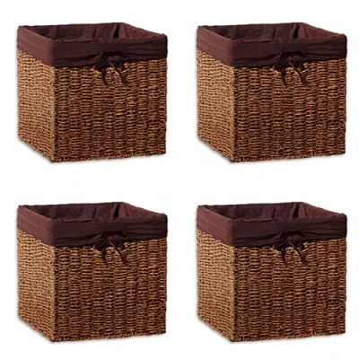 Set of 4 baskets with removable fabric liners. Each basket measures 12"L x 12"W x 12"H Made from paper rope over a sturdy iron wire frame. Liners can be removed and washed with like colors. Tumble dry low Folds flat for easy storage Rich walnut finish enhances any décor By Trademark Innovations