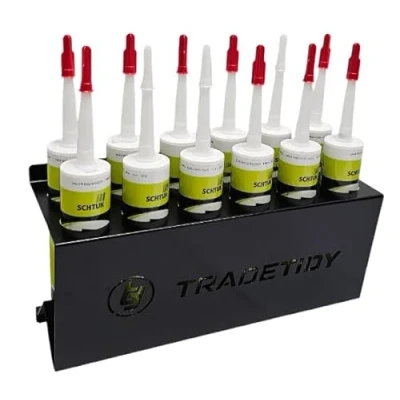 ManoManoGeneral description Ideal for use in the back of a van or in a workshop, the Tradetidy TT-STB12 Silicone Adhesive Caulk Mastic 12 Tube Holder is a strong, durable, and attractive solution for organizing your adhesive tubes. Made in the UK from 1.5mm powder-coated steel, this holder is designed to withstand the rigors of a busy workspace. Technical specifications Material: 1.5mm powder-coated steel Capacity: Holds 12 tubes of silicone