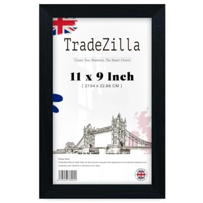 Elegant Framing Options: TradeZilla picture frames 11x9 Inch meticulously crafted from premium 𝐞𝐧𝐠𝐢𝐧𝐞𝐞𝐫𝐢𝐧𝐠 𝐰𝐨𝐨𝐝. These Black frames boast sleek colour borders that seamlessly blend into any decor, whether it's a living room, office, or gallery wall. SIZE - The frame, measuring 279.4 x 228.6 mm is designed to perfectly accommodate your pictures. The Black frame moulding has an approximate width of 30mm and a depth of 15mm. Please remember to peel off the protective films on both sides of the Perspex sheet. The Perspex provides the same clarity as glass. Minimalist Style Frame-The classic 279.4 x 228.6 mm design never goes out of style. Molding comes in beautifully understated, simple and modern style, suit for decorating any room. The overall design ensures that this frame 9 x 11 Inch is stable and reliable. Thoughtful Gifting: These sleek and minimalist Black frame are a perfect decorative addition to homes, offices, hotels, restaurants, and coffee shops. Their versatile design makes them an ideal, thoughtful gift for family and friends, enhancing any space with elegance and style. Satisfaction: At TradeZilla, your satisfaction is paramount. We strive for excellence in our product experiences and carefully package with shrink-wrapped, our frames to arrive in pristine, perfect condition.