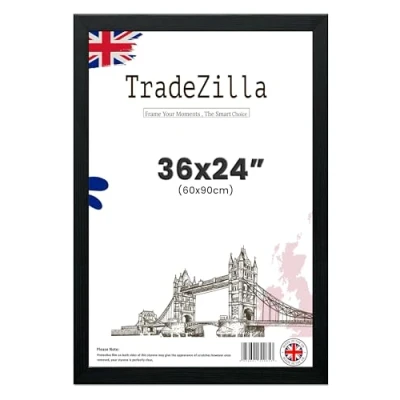 The Beauty of Simplicity: The simple and classic 60 cm x 90 cm Black design Frame of the TradeZilla is made up of engineering wood which durable & strong & Designed with a shatterproof, Perspex. UV-resistant front HD Styrene that protects the photos from dust, moistness, corrosion. Instead of real glass, Size Dimensions: The picture display of the 36 x 24 Inch poster frames. Total 600 x 900 mm Frame is an exact fit for images. Perfectly fits and standard frames. Stylish and Easy to Use: Elevate your home decor with our 90 x 60 cm picture frame. Designed for convenience, it features metal clips on the back for effortless picture insertion and a sturdy cardboard backing to keep your photos secure. This versatile Black frame can be hung both vertically and horizontally, allowing you to showcase your art, diplomas, posters, and more. Create a stunning memory wall that enhances the aesthetic appeal of any room. Ideal Decor and Gift: These elegant Black gallery wall picture frames effortlessly blend into any home or office decor, adding a touch of sophistication. They are not only perfect for enhancing your space but also make thoughtful gifts for friends, family, or as a housewarming or Christmas present. Made in the UK: All of our picture frames are made in United Kingdom. We hold ourselves to an incredibly high standard and pride ourselves on putting customer satisfaction first.