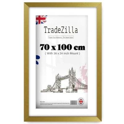 Sturdy Construction: TradeZilla 700 x 1000 mm Gold frame Crafted from high-strength, high-density engineered wood & metal clip on back to hold prints, these frames offer robust and durable support for your artwork. The thick, transparent front Perspex Keep your cherished pictures crystal clear and protected for years to come. Size Dimensions: The picture display of the 40 x 28 Inch poster frames. Total 700 x 1000 mm Frame is an exact fit for images. Perfectly fits and standard frames. Display & Art Size Display both horizontally and vertically on the wall, perfectly showcasing your favorite 70x100 cm poster, picture, or art print. This 2' 4" x 3' 3" frame is ideal for home or office wall dรฉcor. ๐๐จ๐ฎ๐ฅ๐๐ข๐ง๐ ๐๐๐๐ฌ๐ฎ๐ซ๐๐ฆ๐๐ง๐ญ๐ฌ โ 30mm wide and 15mm deep. Versatile Display Options: The 28" x 40" frame offers flexible hanging options, allowing it to be displayed horizontally or vertically. This versatility ensures you can showcase your prints in the orientation that best suits your space and artistic vision, providing a customized and stylish presentation. Stylish and Versatile: These 2' 4" x 3' 3" photo frames add a touch of elegance to any room, making them ideal for living rooms, bedrooms, offices, and more. Their sleek and timeless design blends seamlessly with any decor, allowing you to relive your cherished memories in style. Perfect for showcasing your photos, artwork, or certificates.