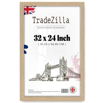 SPECIFICATIONS: TradeZilla frames Made to display 812.8 x 609.6 mm a photo in a beautiful black frame and high-definition clear front Perspex, to preserve your favorite photos. Our moldings have a width of approx. 30mm and a depth of approx. 15 mm. Dimensions and Orientation: This 32 x 24 Inch Oak frame offers versatile display options, allowing you to showcase pictures either vertically or horizontally. Its adaptable orientation ensures that you can present your photos or artwork in the manner that best suits your space and aesthetic preferences. Stylish and Easy to Use: Elevate your home decor with our 60.96 x 81.28 cm picture frame. Designed for convenience, it features metal clips on the back for effortless picture insertion and a sturdy cardboard backing to keep your photos secure. This versatile Oak frame can be hung both vertically and horizontally, allowing you to showcase your art, diplomas, posters, and more. Create a stunning memory wall that enhances the aesthetic appeal of any room. Thoughtful Gifting: These sleek and minimalist Oak frame are a perfect decorative addition to homes, offices, hotels, restaurants, and coffee shops. Their versatile design makes them an ideal, thoughtful gift for family and friends, enhancing any space with elegance and style. Great Choice for Gift: They make a thoughtful gift for various occasions, including birthdays, graduations, weddings, Thanksgiving, anniversaries, baby showers, Father's Day, Mother's Day, and Christmas. Perfect for preserving and displaying your cherished memories with family and friends, these Oak frames add a touch of elegance to every environment.
