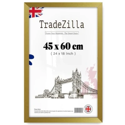 Sturdy Construction: TradeZilla 450 x 600 mm Gold frame Crafted from high-strength, high-density engineered wood & metal clip on back to hold prints, these frames offer robust and durable support for your artwork. The thick, transparent front Perspex Keep your cherished pictures crystal clear and protected for years to come. SIZE - The frame, measuring 450 x 600 mm is designed to perfectly accommodate your pictures. The Gold frame moulding has an approximate width of 30mm and a depth of 15mm. Please remember to peel off the protective films on both sides of the Perspex sheet. The Perspex provides the same clarity as glass. Perfect Size and Dimensions: The frame's inner dimensions are precisely Size, offering a substantial display area for your images. The Inner dimensions measure 18 Inch x 24 Inch, with a stylish frame profile width of 30mm and a depth of 15mm. Ideal Gift for Wall Decor: Enhance the charm of your home decor with these 24 Inch x 18 Inch Gold frames, adding a touch of vintage farmhouse elegance to any space. These frames make a heart-warming gift for various occasions, including Birthdays, Graduations, Weddings, Thanksgiving, Anniversaries, Baby Showers, Father's Day, Mother's Day, and Christmas. 𝗖𝘂𝘀𝘁𝗼𝗺𝗲𝗿 𝗦𝗮𝘁𝗶𝘀𝗳𝗮𝗰𝘁𝗶𝗼𝗻 𝗚𝘂𝗮𝗿𝗮𝗻𝘁𝗲𝗲𝗱: We take pride in the quality and craftsmanship of our TradeZilla Poster Frame. Your satisfaction is our top priority, and we stand by our product. If you're not completely satisfied, please don't hesitate to reach out to us, and we'll make it right.