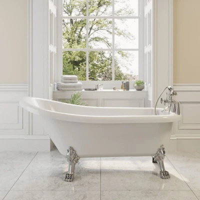 General description The Freestanding Traditional Bath Acrylic - 1550mm Buxton Single Ended with Dragon Feet combines the luxury of a slipper bath with a modern aesthetic. Its elegant roll top edge and traditional dragon feet design create a stunning centerpiece for any bathroom, offering both style and comfort for hours of relaxation. Technical specifications Length: 1550mm Width: 750mm Height: 760mm Fill Capacity: 140L Weight: 29kg Compatibility and accessories This bath allows for deck or floor mounted taps, which are not included but can be purchased separately. Various stylish options are available to match your desired aesthetics. Installation All necessary fittings are included, made from 304 stainless steel, along with a leg set featuring built-in adjusters for a flat installation. It is essential to use a spirit level during installation to ensure proper drainage. Usage Designed for comfort and durability, this bath is made from Genuine Lucite acrylic, providing a beautiful
