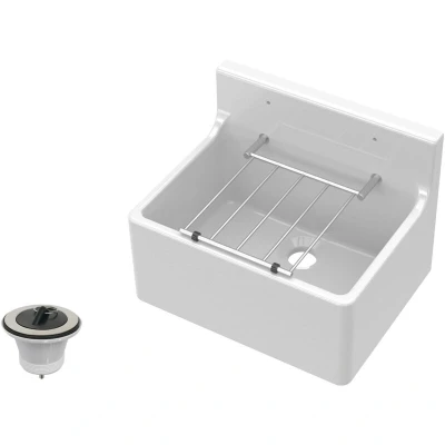 ManoManoTraditional Fireclay Cleaner Sink with Waste - 515 x 382 x 393mm Manufactured to the highest quality and standards, the Fireclay Cleaner sink from Balterley is a reliable and elegant functional sink for your home. Hand finished by Master Potters and rigorously checked, this single bowl sink brings additional functionality and style to your home. With a high splash back, deep single bowl and a chrome grill, this sink is perfect for commercial uses, busy utility and janitorial rooms. The single bowl sink has a wall hung design. With a chrome grid and compatible waste. Due to the nature of the materials and process, please allow for a tolerance of +/- 5mm of the basin. Product Highlights An elegant and functional wall hung Fireclay cleaner sink with grid and compatible waste Manufactured from high quality materials, handcrafted by Master Potters to produce a high quality sink Created using a traditional fire clay methods making it reliable, durable and authentic Classic and iconic design