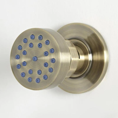 General description Create a spa-like experience every time you shower with the traditional Milano round body jet. Producing a single spray pattern to gently soothe and massage your body, this premium quality solid brass body jet features a front fix design for easy installation. The classic moisture blemish resistant brushed gold finish enhances the elegant look, while silicone nozzles enable easy cleaning and removal of limescale deposits. Technical specifications Material: Solid brass Finish: Brushed gold Dimensions: 53mm x 63mm Inlet connection: 1/2” Recommended minimum pressure: 1.0 bar Compatibility and accessories Compatible with domestic and commercial plumbing systems Installation Front fix design for easy installation Usage Produces a single spray pattern to massage and soothe your body Swivel joint allows you to adjust the spray direction Other information This product is covered for 10 years The hand-finished nature of this item means that the color and tone can vary